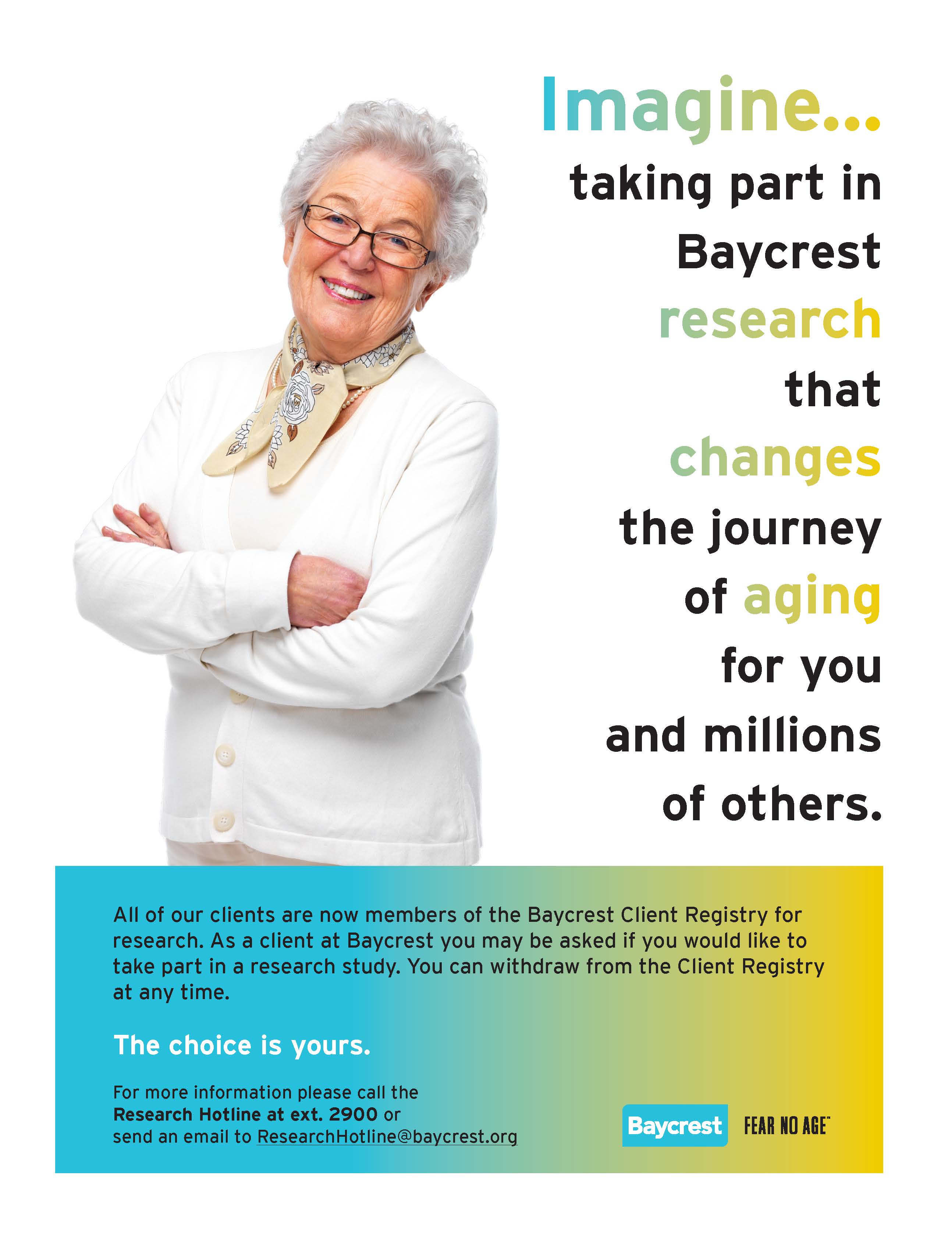 Clients of the Apotex Centre, Jewish Home for the Aged; Baycrest Terraces Retirement Residence; and all current Baycrest inpatients and outpatients have the opportunity to contribute to the ground-breaking research taking place at Baycrest. Baycrest’s Client Registry is a secure, searchable database comprised of a limited selection of health information. The Client Registry will be used to match health information to the eligibility criteria for research studies being conducted at Baycrest’s Rotman Research Institute, home to some of the world’s most renowned cognitive neuroscientists. This means that a researcher may ask a client if they would like to take part in a research study that has been approved by the Baycrest Research Ethics Board. Those who do not wish to participate can opt out of the Client Registry or decline to take part in a research study at any time by calling the Research Hotline at 416-785-2500 ext. 2900. In compliance with the Personal Health Information Protection Act (PHIPA), all healthcare information is kept strictly confidential, secure and protected. The well-being of our clients is our priority and quality of care will not be impacted in any way whether or not someone chooses to take part in research. For more information see the documents provided below. Baycrest Client Registry Brochure Baycrest Client Registry FAQ