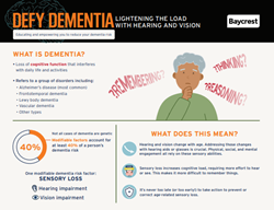 Defy Dementia Episode 1: Lightening the Load with Vision and Hearing Welcome to the first episode of Defy Dementia! Join hosts Jay Ingram and Dr. Allison Sekuler as they provide essential insights on dementia, with a special focus on sensory loss as a key risk factor. Hear the inspiring stories of Laurie Harris, diagnosed with hearing loss at age 6, and Dr. Walter Wittich, an expert in vision and hearing loss who also cares for a loved one living with dementia. Through this exciting inaugural episode, we’ll empower you with knowledge and actionable steps to help safeguard your brain health, especially if you experience hearing or vision loss as you age. Episode 1: Transcript Key takeaways Hearing and vision changes are part of the normal aging process, BUT it's important to do something about these changes by getting glasses or hearing aids. Physical, social, and mental engagement all depend on your sensory abilities and will be easier with the right supports. Sensory loss increases cognitive load - more effort is required to hear or see something, which makes it harder to do other things, like remember what you just heard or saw. It’s never too late (or too early!) to take action to prevent or correct age-related sensory loss. Key highlights Jay: "Dementia is actually a general term, not a specific disorder. Alzheimer's is one kind of dementia – by far the most common – but there are others, like fronto-temporal dementia, Lewy Body dementia, and vascular dementia. In each case, there’s a gradual breakdown of nerve cells – neurons – and the connections among them. Over time the brain gradually loses abilities like thinking, remembering, and reasoning." Allison: "It’s projected that worldwide, by the year 2050, there will be at least 150 million people with dementia, including one million in Canada alone. But […] dementia is not just in our genes - in fact, the genetic variants that cause dementia have been identified in a relatively small number of people - so just because your grandma or grandpa had dementia, doesn’t mean you’ll get it." Laurie: "Get into the audiologist, get a test, get a baseline on file, if nothing else, so that when you feel like maybe next year you've lost a little bit more, you can go back in and get tested in and you'll have some really good data on whether or not you have actually lost more hearing, or if there might be something else going on." Walter: "I think that no matter what challenges have appeared or are to come for any of us, there is something you can do. There is a solution just around the corner. You have to be resilient, at times, to find it. This may not always be obvious, but we've been around long enough to know a lot of things about sensory and cognitive changes. We just need to push forward and find the thing you need that lets you live the best life you can live." Infographic Please click to enlarge Resources Baycrest’s free, online hearing loss screening test Hearing Loss: A Common Problem for Older Adults – from the National Institutes of Health’s National Institute on Aging Sensory Leaflet Association of Hearing Aids and Cochlear Implants With Cognitive Decline and Dementia: A Systematic Review and Meta-analysis – from JAMA Neurology Hearing Aids and Cochlear Implants in the Prevention of Cognitive Decline and Dementia—Breaking Through the Silence – from JAMA Neurology Helpful tools for a full, independent life with vision loss CNIB Foundation Improving vision may help prevent dementia – from Harvard Health Seniors and Aging - Vision Care – from Health Canada Hearing aids, counselling may slow cognitive decline for some seniors, new study finds – CBC News Learn more about our guests Laurie Harris is a 58-year old British Columbian who works at an organization that sets older adults up with non-medical help, such as housekeeping, that would help them live at home longer. She was diagnosed with hearing loss at age 6 and began to wear hearing aids at age 24. Several years ago, she took a leave of absence from her job because she says she was exhausted, in large part, from the cognitive load that was needed to process the speech of others while being hard of hearing. Since then she has become much more mindful about looking after her brain. She meditates and paces herself. She is also a caregiver, which is an added stress. Her husband is 22 years her senior and needs more and more help. She has returned to work and is managing a busy life. She is an optimist, but also rues not having more information from doctors and public sources about deafness and cognitive load earlier in her life. Dr. Walter Wittich is an Associate Professor at the School of Optometry at the University of Montréal, in Québec, Canada. His research focuses on the rehabilitation of older adults with combined vision and hearing loss. His research domains include basic sensory science, as well as medical, psychosocial, and rehabilitation approaches to sensory loss. He is the inaugural chair of the Deafblind International Research Network, the 2020 recipient of the Canadian Helen Keller Centre 10th Annual JT Award, is a Fellow of both the American Academy of Optometry, and the Association for Research in Vision and Ophthalmology, and is Québec’s first Certified Low Vision Therapist. For the past 2 years, he and his husband have been care providers for his mother-in-law who lives with them with vascular dementia, Alzheimer’s disease, and the after-effects of a stroke from a year ago. He was a professional ballet dancer until age 30, then switched careers to be a researcher.